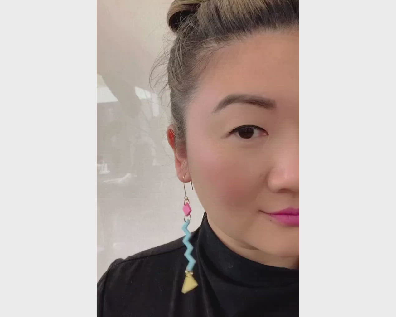 I just love this Zig Zag dangly earring. Memphis Design for your ears! Geometric and fun, this Zig zag retro earring hangs long but cuts a slim profile so they're not too loud. Just loud and funky enough to spice up any outfit. Choose between an 80s or 90s color palette!
